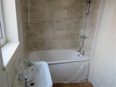 Three piece suite comprising low level wc, pedestal wash hand basin, bath with shower over, tiled splashback and double glazed window to side elevation.