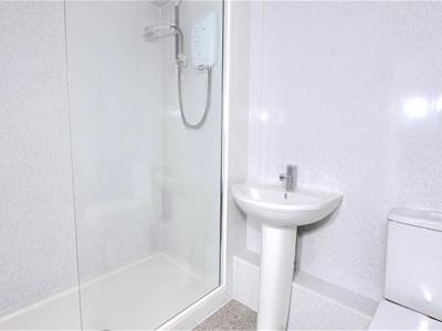 Modern shower room with walk-in shower cubicle and electric shower, wash basin and WC.