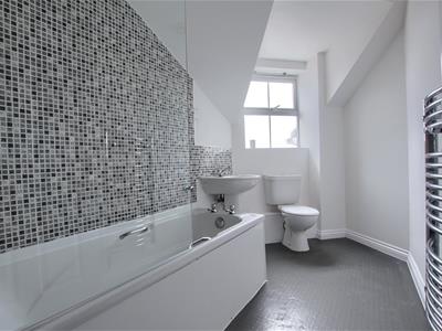 With close coupled toilet, pedestal washbasin, bath, tiled walls and electric chrome towel radiator.