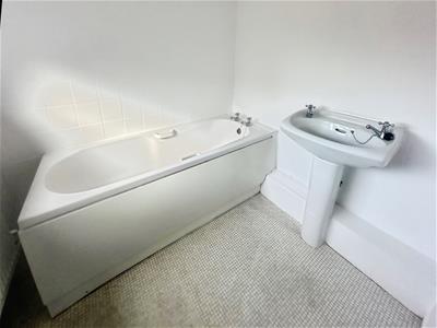 4 Piece white suite comprising of: Panelled bath, pedestal wash hand basin, single radiator, tiling to walls, double glazed rear window.
