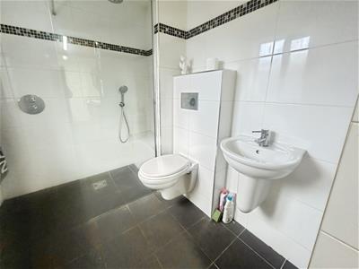 Low level wc, wash hand basin, tiled floor and walls, spotlights, towel rail, walk in shower with mains shower.