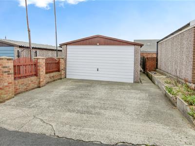 comprises an open-plan lounge and dining room with a feature fireplace. There is a fitted kitchen to the rear, a small hallway with a useful storage cupboard, and a ground-floor shower room. On the first floor, there are two bedrooms, both with built-in storage. To the rear, there is a gated yard, across the lane, there is a driveway, a double detached garage with a remote access door, and a lawned garden. Additionally, the property is centrally heated and double-glazed.