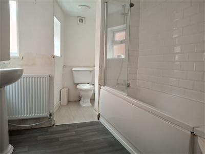 2.29m a 2.09m (7'6" a 6'10")White suite, bath and shower attached. Wash hand basin, splash back tiles. Separate WC.