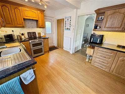 Fitted wall and base units with work surfaces incorporating; single drainer sink unit with mixer tap, space for free standing cooker, washing machine, fridge freezer and dryer. Cupboard housing combi boiler and pantry. Double glazed window and door to side.