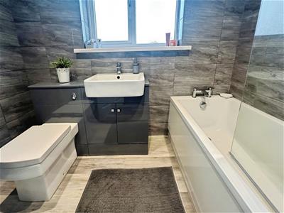 3-piece white suite comprising: panelled bath, electric shower over, wash hand basin, low level wc, spotlights, double glazed rear window, heated towel rail, tiling to walls, laminate flooring.