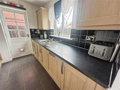 Double glazed rear window, range of wall floor and drawer units with coordinating roll edge work surfaces, stainless steel sink unit and drainer with mixer tap, tiled splash backs, built in electric fan assisted oven, electric hob with extractor fan above, space for fridge freezer, plumbed for washing machine and dishwasher, tiling to floor, spotlights, door to rear.