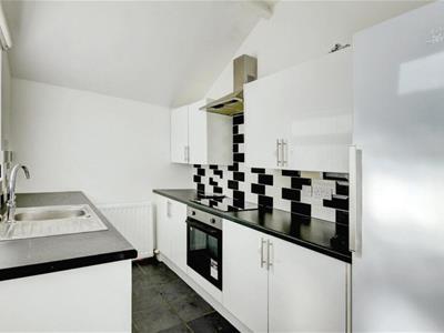 Range of wall and floor units with laminate worktop surfaces, built in electric oven and hob with extractor hood, sink unit and drainer, plumbing for washing machine, tiled splashback, radiator, part glazed upvc door to rear and double glazed window.