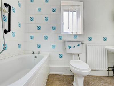 Three piece suite comprising bath with electric shower over, low level wc, pedestal wash hand basin, built in cupboard housing central heating boiler, radiator, double glazed window to rear elevation and tiled splashback.