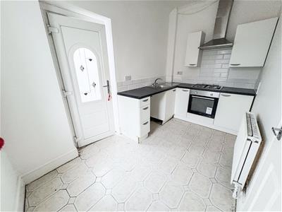 double glazed window to side, double radiator, range of wall, floor an drawer units with coordinating roll edge work surfaces, stainless steel sink unit with mixer tap, tiled splash backs, electric oven and gas hob, tiling to floor and double glazed door to rear yard.
