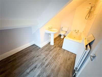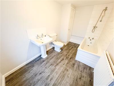 panelled bath, hand basin, low level wc, double glazed window to side, and double radiator.