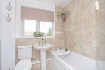 * Modern bathroom fitted with a white suite comprising a panelled bath, wash hand basin and WC, heated towel rail, window and tiled floor.