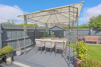 * Driveway providing off road parking space for two vehicles with borders and a path at the side leads via a gate to the rear garden which has recently been landscaped to extend the sandstone patio to full width beyond which there is a raised deck and lawn. It is an attractive well presented outside space ideal for entertaining and al fresco dining. There is also an outside tap.