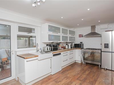 * Good sized kitchen with ample space for table and chairs, door to conservatory, a range of base and eye level units with wooden worktop over, space for cooker, space for range style cooker, extractor fan, space for American style fridge freezer, tiled splashback, Belfast sink.