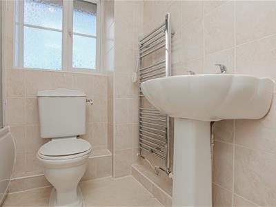 * Bathroom fitted with a suite comprising bath, WC, wash hand basin, window, heated towel rail, tiled surround.