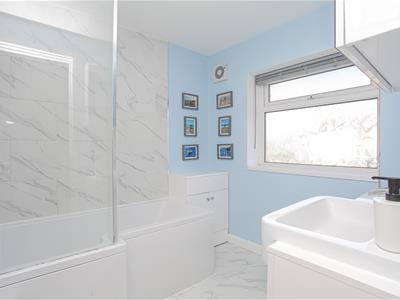 * Bathroom refitted in 2019 comprising a modern white suite with bath with shower over, WC, wash hand basin with vanity unit, tiled floors and part tiled walls, window to front.