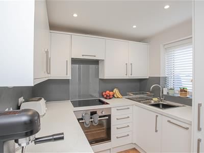* Kitchen access via hallway with laminate floor, base and eye level units with white worktops and white cupboard fronts. This was refitted in 2021. Integral oven with four ring electric hob and extractor over, integral dishwasher, integral under counter fridge, window to front and under stairs storage cupboard with inbuilt shelving.