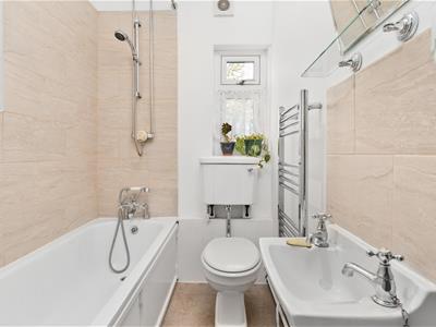 * Bathroom fitted with a white suite comprising panelled bath with shower over and tiled surround, wash hand basin and WC, newly plastered and tiled, window.
