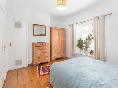 * Main bedroom with bay window to front and seat under, exposed wood floor, door to cupboard housing the wall mounted Gloworm gas boiler which was replaced within recent years.
