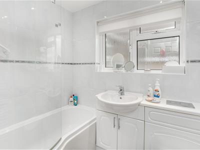 * Bathroom fitted with a white suite comprising P-shaped shower/bath with shower unit over and fully tiled surround, semi recessed wash hand basin and WC, window, heated towel rail.