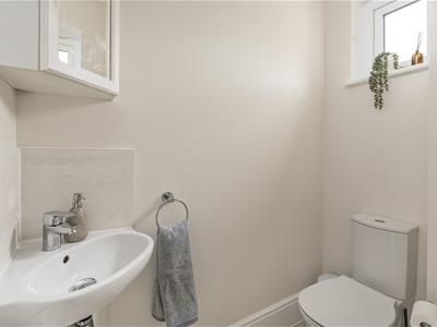 * Spacious hallway with storage and door to the ground floor WC fitted with a white suite and window.
