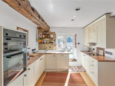 * Kitchen/dining room fitted with a range of base and eye level units, integrated double oven, integrated dishwasher, four ring electric hob and extractor over, space for fridge freezer, inset sink, built-in shelving, exposed beam, exposed stone wall, window seat with window to front, door to the living room, doorway to the stairs to second floor.