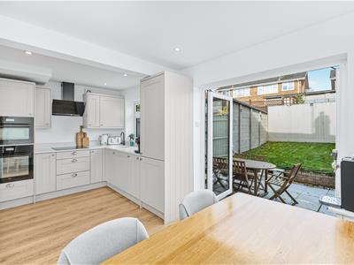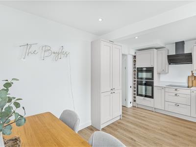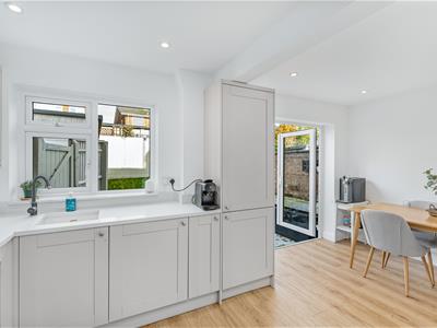* Kitchen diner re-fitted in 2023 with a range of base and eye level units with neutral fronts and a quartz worktop over, integrated oven, four ring induction hob, integrated washer dryer, integrated fridge freezer, space for table and chairs, double doors to the rear garden.