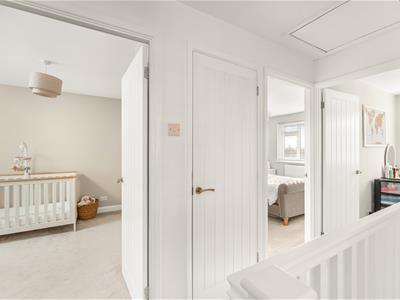 * First floor landing with doors to all rooms, window to side, hatch to loft and airing cupboard.