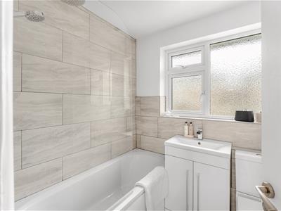 * Bathroom fitted with a white suite comprising bath with shower unit over, WC and vanity wash hand basin, tiled walls, tiled flooring, heated towel rail, window to rear.