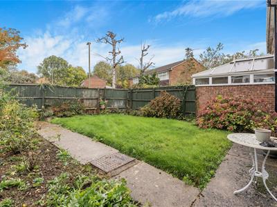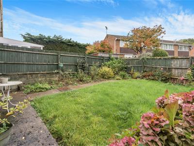 * The rear garden is mostly laid to lawn with plant borders.