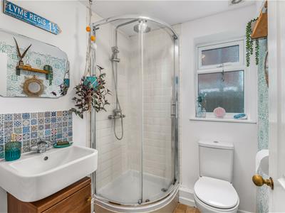* Ground floor shower room/WC with a white suite and Travertine floor tiling, heated towel rail and window.