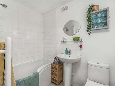 * First floor bathroom fitted with a white suite comprising P shaped bath, wash hand basin, WC, ceramic tiled floor, heated towel rail and window.