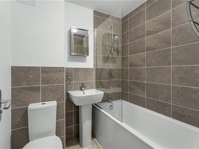 * Bathroom fitted with a white suite comprising a panelled bath with shower over and textured tiled surround, wash hand basin, WC, extractor.