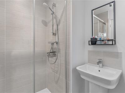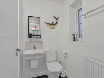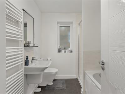 * Family bathroom with a four piece white suite comprising panelled bath, separate fully tiled shower cubicle, wash hand basin and WC, window, ceramic tiled floor and extractor.