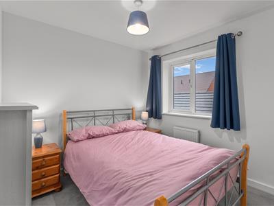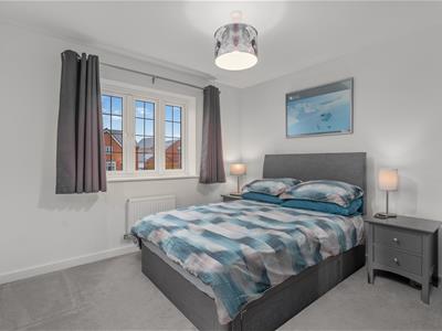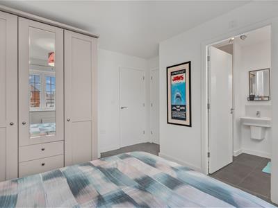 * Main double bedroom with window to front overlooking the green space, ample space for wardrobes, door to built-in cupboard over the stairs, door to ensuite shower room fitted with a white suite.