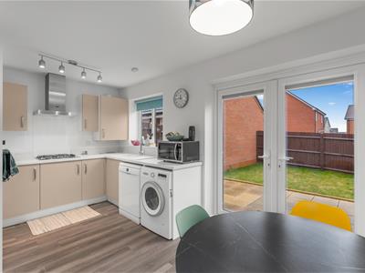 * Open plan kitchen/dining room with grey matt units incorporating a built-in oven, gas hob and extractor, plumbing for washing machine and dishwasher, marble effect work surfaces, space for table and chairs, French doors opening to the rear garden, space for fridge/freezer, wall mounted gas fired oiler in a wall unit.