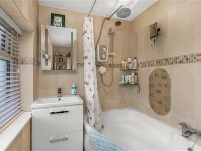 * The bathroom is fitted with a white suite comprising a corner bath with shower over, WC and vanity wash hand basin, heated towel rail, tiled floor and walls, window to rear.