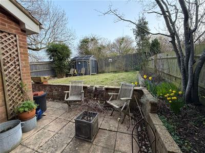 * The rear garden comprises a patio immediately outside the back door. Steps lead up to a lawned area with a border of trees and bushes. Garden shed. Gated side access..