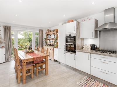 * Kitchen/dining room fitted with a range of grey gloss base and eye level units with worktop over, tiled flooring, integrated fridge freezer, integrated dishwasher, integrated washing machine, double oven with five ring gas hob and extractor over, washer/dryer, window to front, double doors to rear garden, ample space for table and chairs.