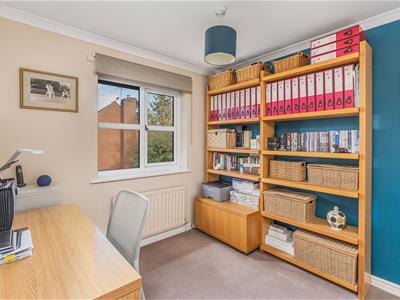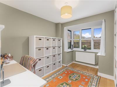 * Study/playroom with bay window to rear overlooking the garden, engineered Oak flooring continued from the hallway, built-in media wall storage unit.