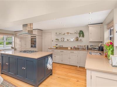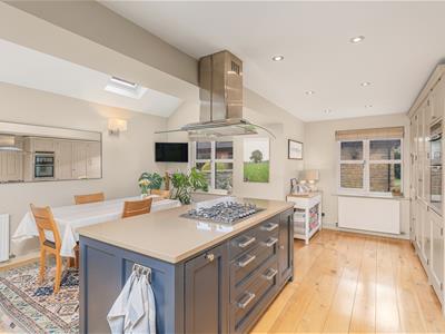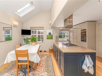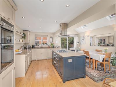 * Kitchen/dining/family room refitted with a modern Hunts range of base and eye level units with Caesar stone worktops over, integrated Neff double oven, kitchen island with Neff five ring gas burner with extractor over, Neff dishwasher, Bosch integrated fridge freezer, large integrated pantry cupboard, engineered Oak flooring, two velux windows above the dining space with built-in blinds, two windows to the front, window and patio doors to rear garden, ample space for dining furniture.