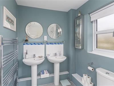 * Family bathroom fitted with a white suite comprising bath with shower over, WC and his and hers wash hand basins, heated towel rail, part tiled walls and a window to the rear.