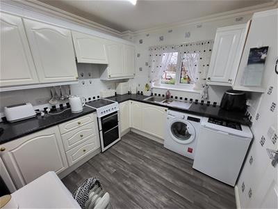 2.64m x 3.05m (8'8 x 10')With a range of base units and matching wall cupboards complimented by rounded edge work surfaces with tiled splash backs, Inset stainless steel sink unit with rinsing sink and tower mixer taps. Night storage heater fitted, power points, Flavell freestanding electric cooker fitted and plumbing for automatic washing machine. Vinyl floor covering and white uPVC double glazed window.