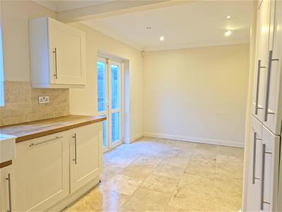 The ground floor features a modern kitchen fitted with sleek white units, wooden worktops and integrated appliances, including a double oven and a chimney-style extractor. A bright living area benefits from a charming bay window, allowing plenty of natural light and creating a comfortable space for seating and relaxation.