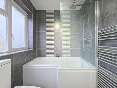 On the first floor, the property offers well-proportioned bedrooms along with the bathroom. The main bedroom is a generous size and benefits from built-in storage, while the modern bathroom features a 3 piece suite with bath, basin and WC, finished with contemporary grey tiling and modern fittings.