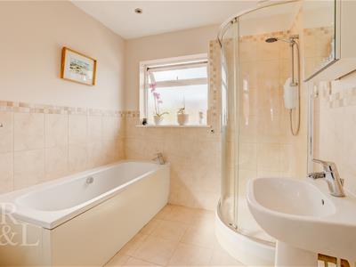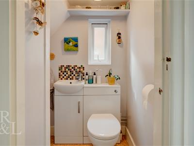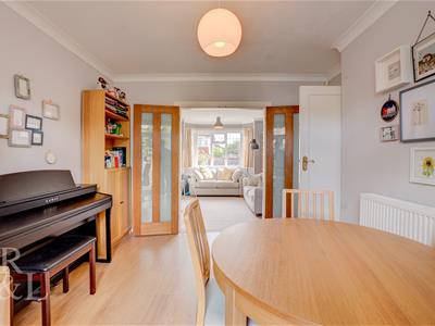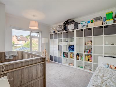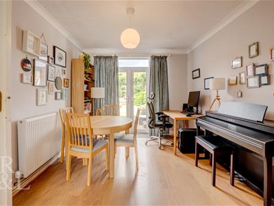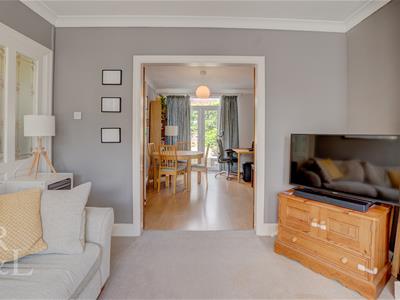 Ground floor accommodation comprises of an entrance hallway which leads you into the main reception rooms, kitchen and stairs to the first floor. The living room is a great size with a front aspect bay window flooding the room with natural light, pieced together with a log burner for those winter months. The living room leads into the dining room through French doors providing an open feel which is great for the family. The dining room also grants access to the rear garden through further French doors. The kitchen is ample in size with integrated appliances such as an integrated Rangemaster oven, gas hob and extractor hood, along with a built in dishwasher and washing machine. The ground floor is completed with an under stair WC and ample storage space.