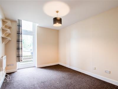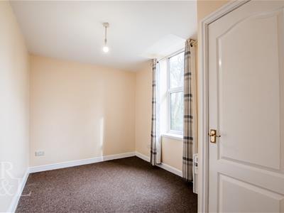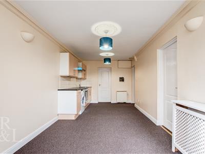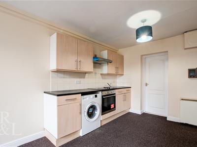 Interior accommodation comprises an open plan kitchen, living, dining room showcasing a front aspect bay window flooding the room with natural light. The kitchen area provides integrated appliances such as an oven, hob and extractor fan with more than enough room to add freestanding appliances. Both bedrooms are well proportioned doubles and share a tiled three piece suite bathroom consisting of a bath with shower overhead along with a wash basin and WC.