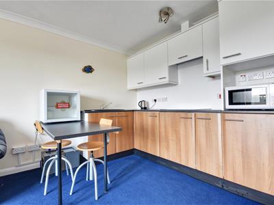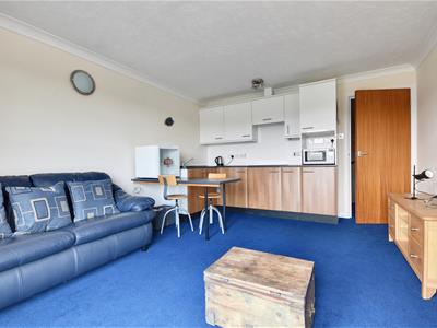 4.579 x 3.617 (15'0" x 11'10")Juliet balcony overlooking river and views across to Rye Harbour, carpet flooring, electric heating, open plan space with modern kitchen units comprising induction hob and wall units for storage.