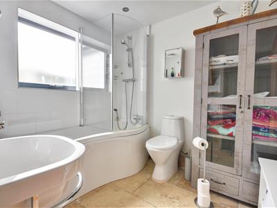 2.490 x 2.077 (8'2" x 6'9")Bath with clear shower screen, wall mounted shower, ceiling spotlights, window to side.