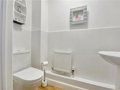 1.829 x 2.116 (6'0" x 6'11")Window to rear, bath with shower over, heated towel rail, toilet and basin.