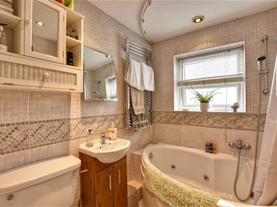 1.95 x 1.59 (6'4" x 5'2")Window to the side. A white suite comprises a corner bath, wash basin and wc.